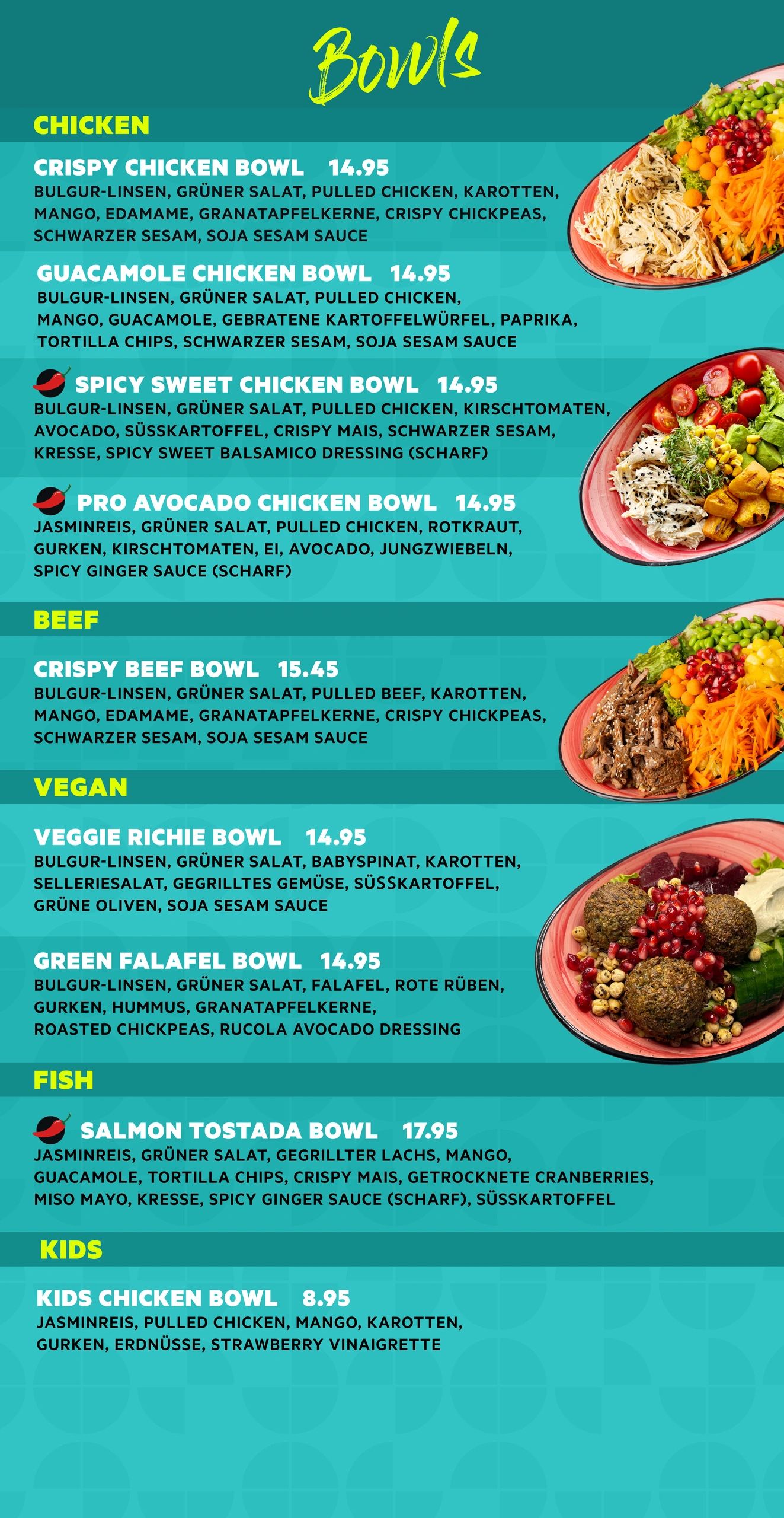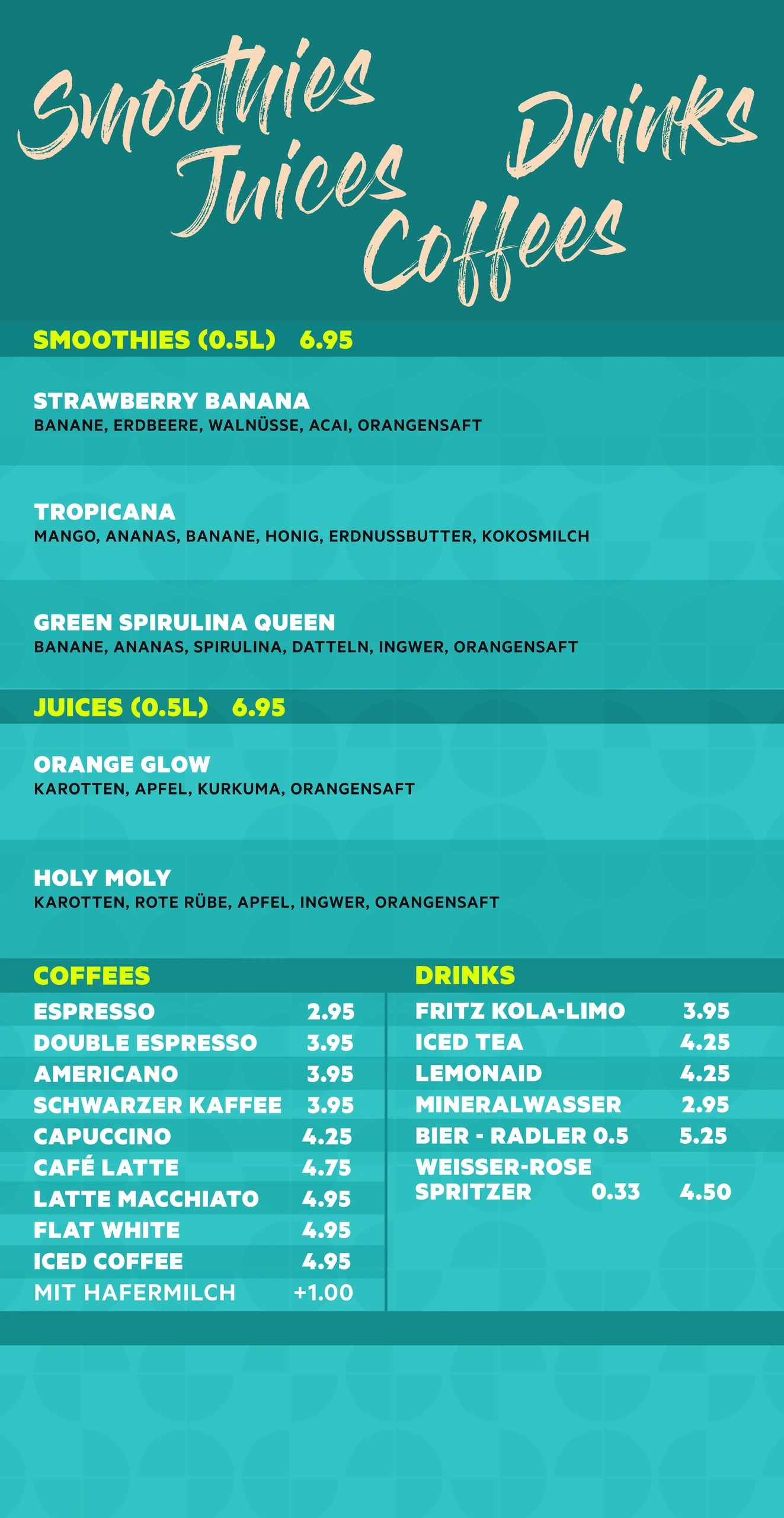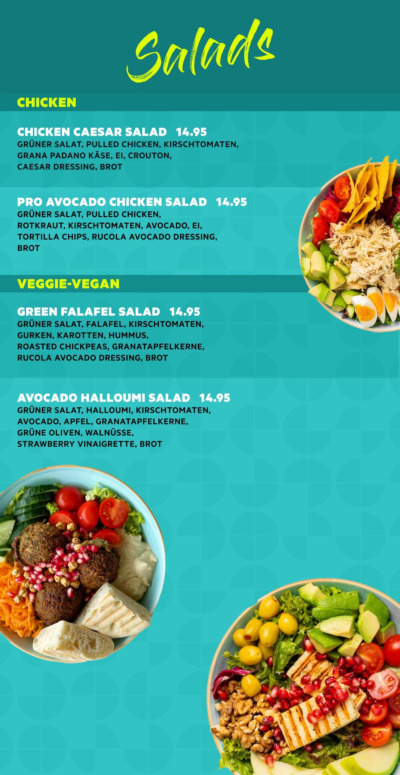 SALADS, BOWLS, HOT WRAPS, SMOOTHIES, FRESH JUICES, DESSERTS, COFFEES, DRINKS, VEGGIE and VEGAN OPTIONS